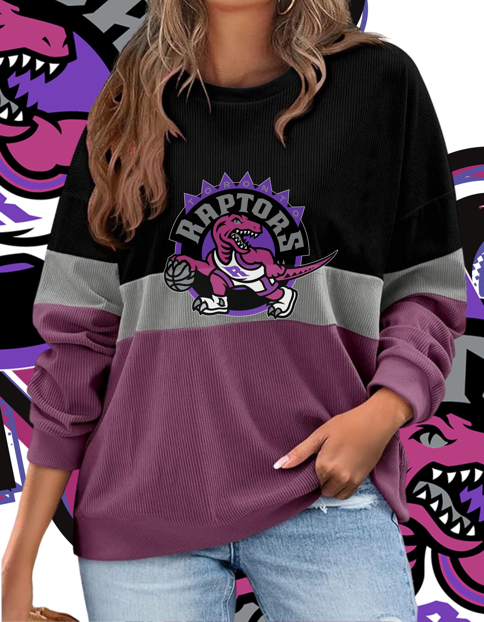 Vintage Toronto Raptors sweatshirt featuring the iconic 90s logo. Dropped on a black grey and purple colour block sweatshirt with that soft vintage feel and heavy street vibe.