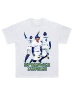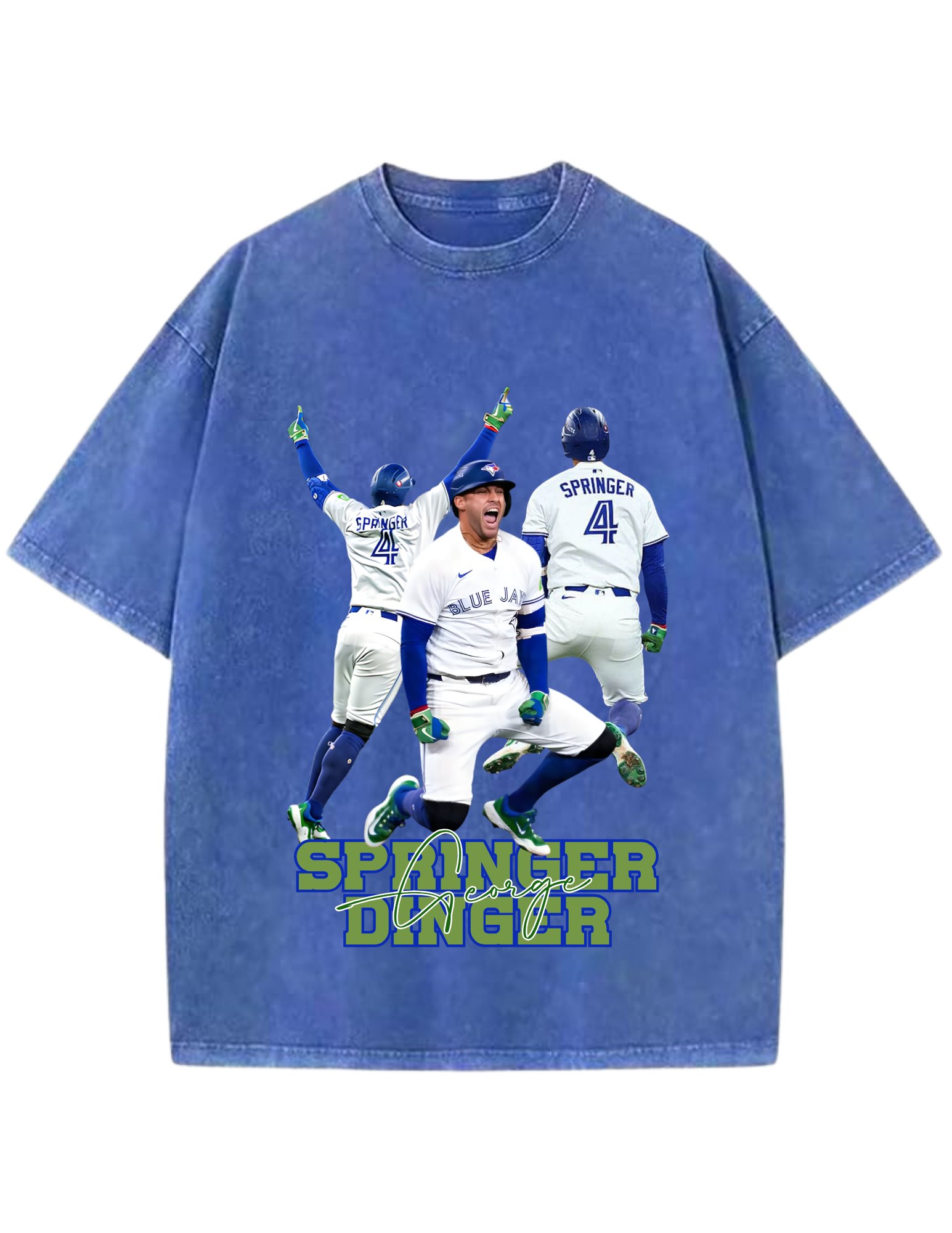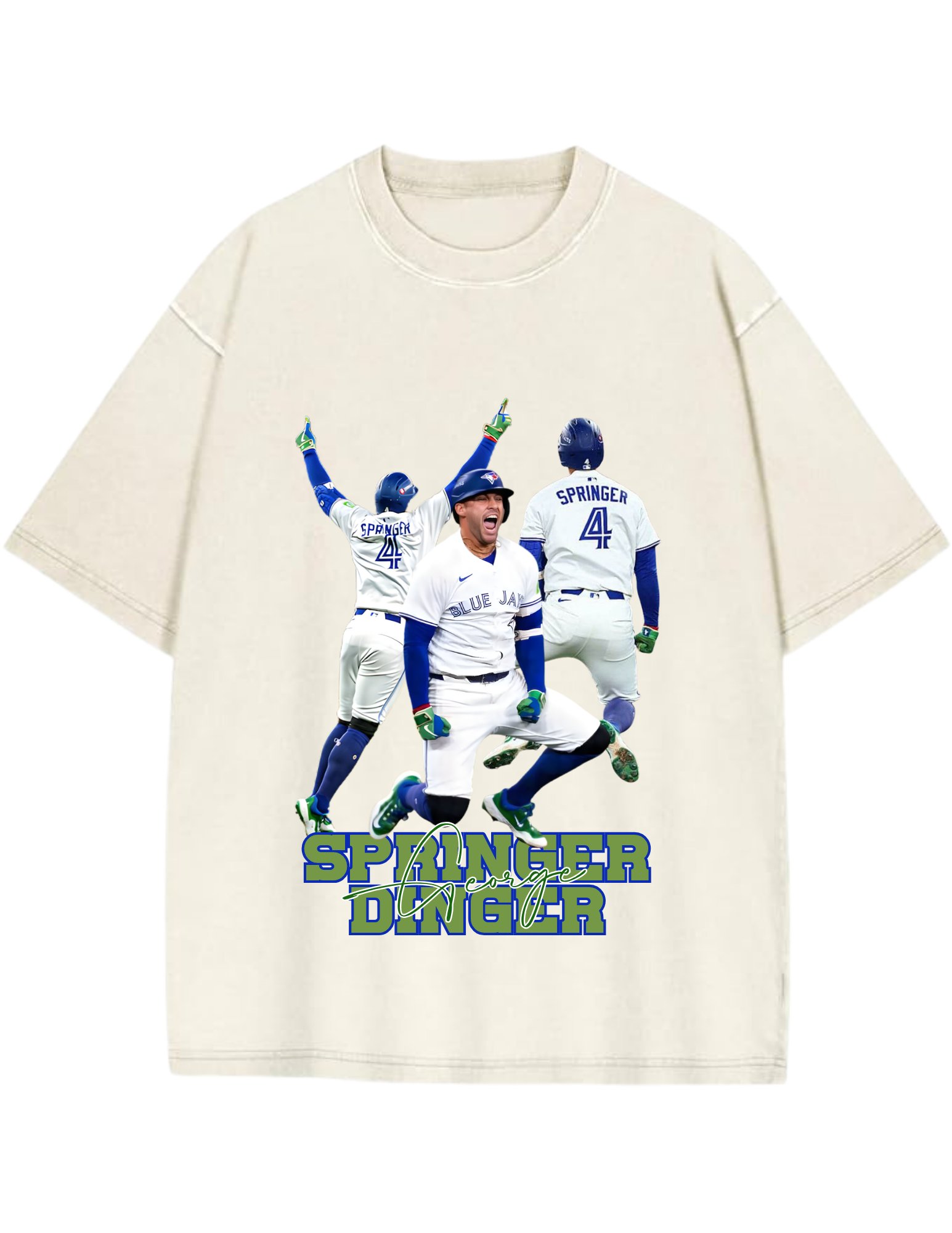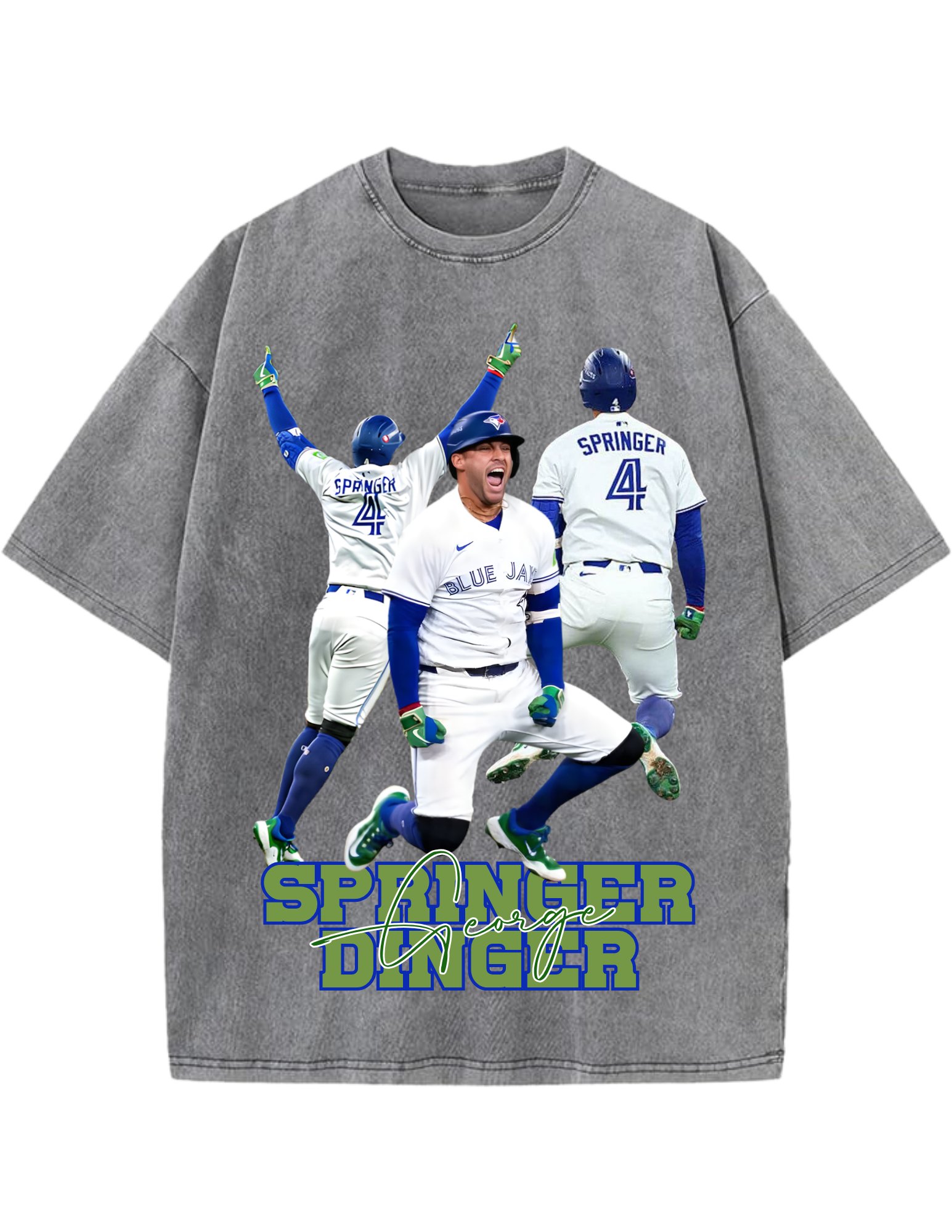Our boy George always putting the Spring in Springer. This tee features George going full grasshopper mode after hitting a much needed Springer Dinger to secure the playoff victory against the Mariners in Game 7 to make them the American League Champs of 2025, battling through a knee injury no less.