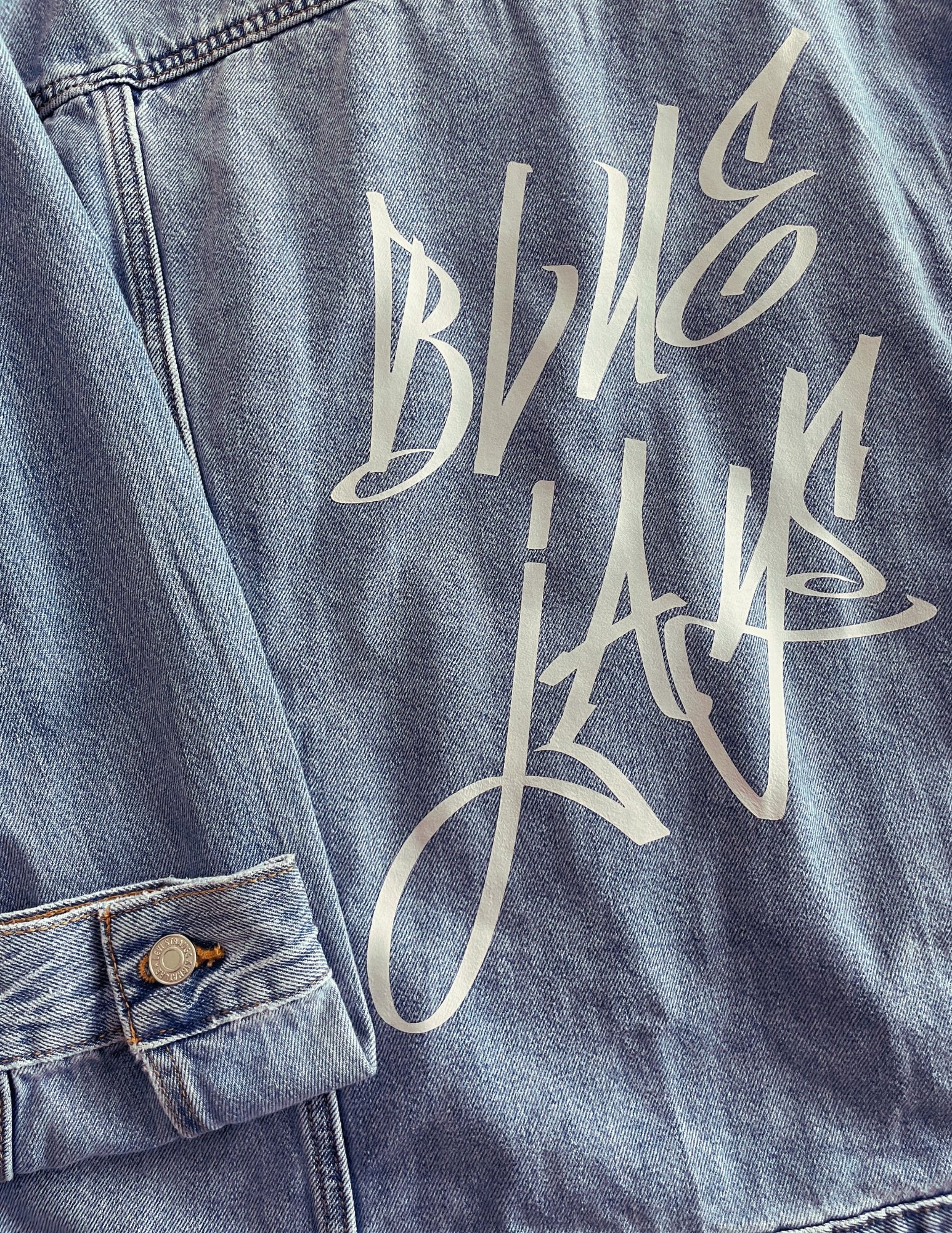 Authentic Levi's Denim Jacket decorated in Toronto Blue Jays graffiti and vintage logo. Distressed and oversized, perfect for wearing to the game.